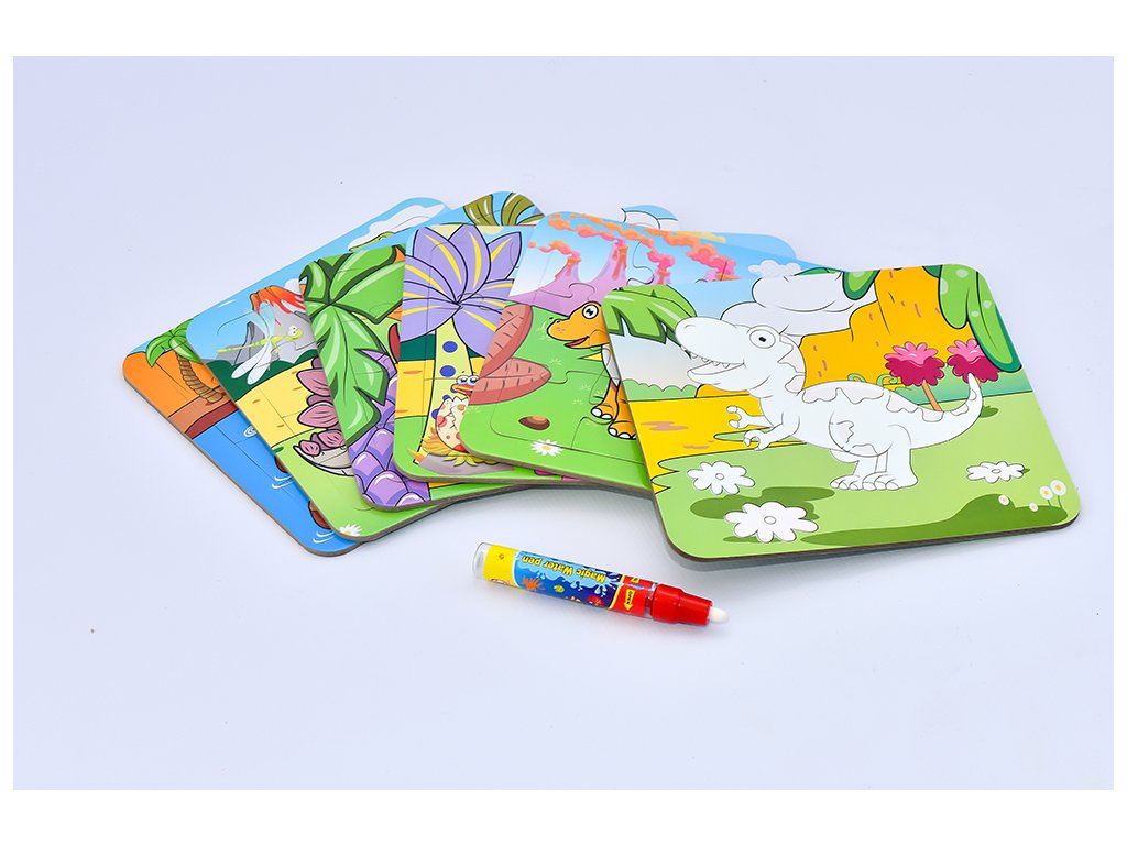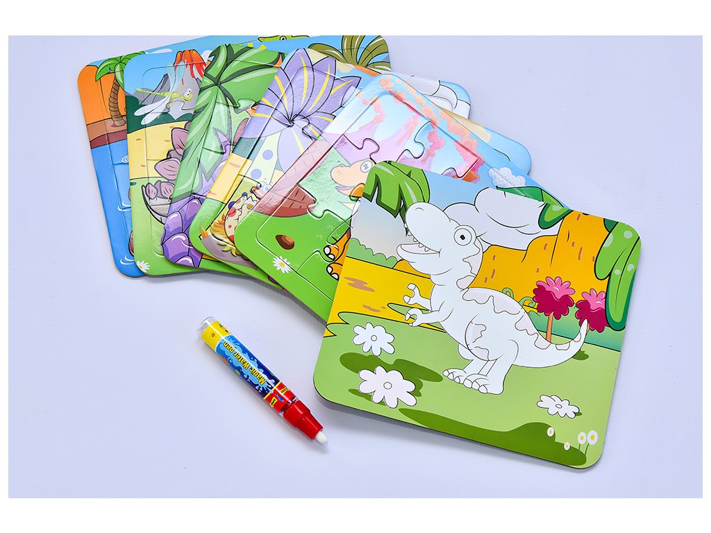 Slož si puzzle a stejný obrázek si vybarvi. Naplň vodu do přiloženého pera a můžeš malovat. Po uschnutí lze malovat znovu.