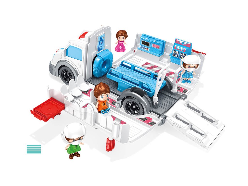 Auto sanitka rozkládací s 2 figurkami. Rozměry 30x9,5x14 cm. Volná kola. Obsahuje, auto, vnitřní vybavení, 2 figurky, polepy. Obrázkový návod na sestavení a používání na zadní straně obalu.