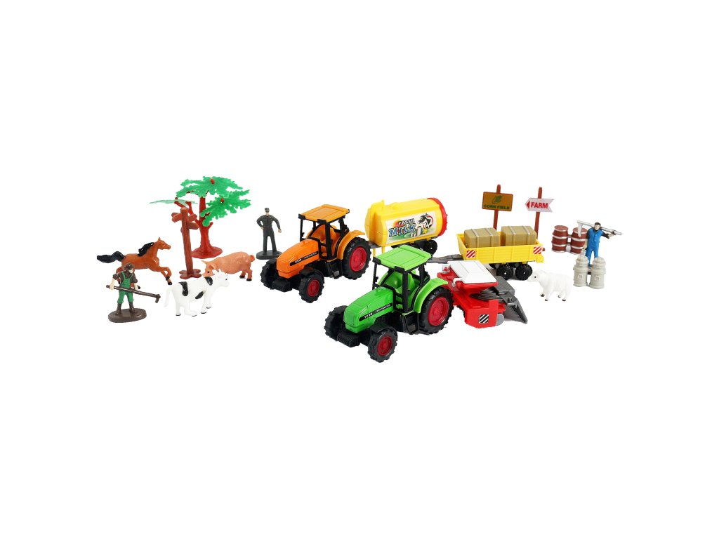 Farma set. Velikost traktorů 7,5 cm, figurek farmářů 4 cm. Součástí 2 traktory, 3 figurky farmářů, figurka koně, prasete, krávy, ovečky, rozcestník, cedule, sudy a další. 2 varianty - větrník, strom.