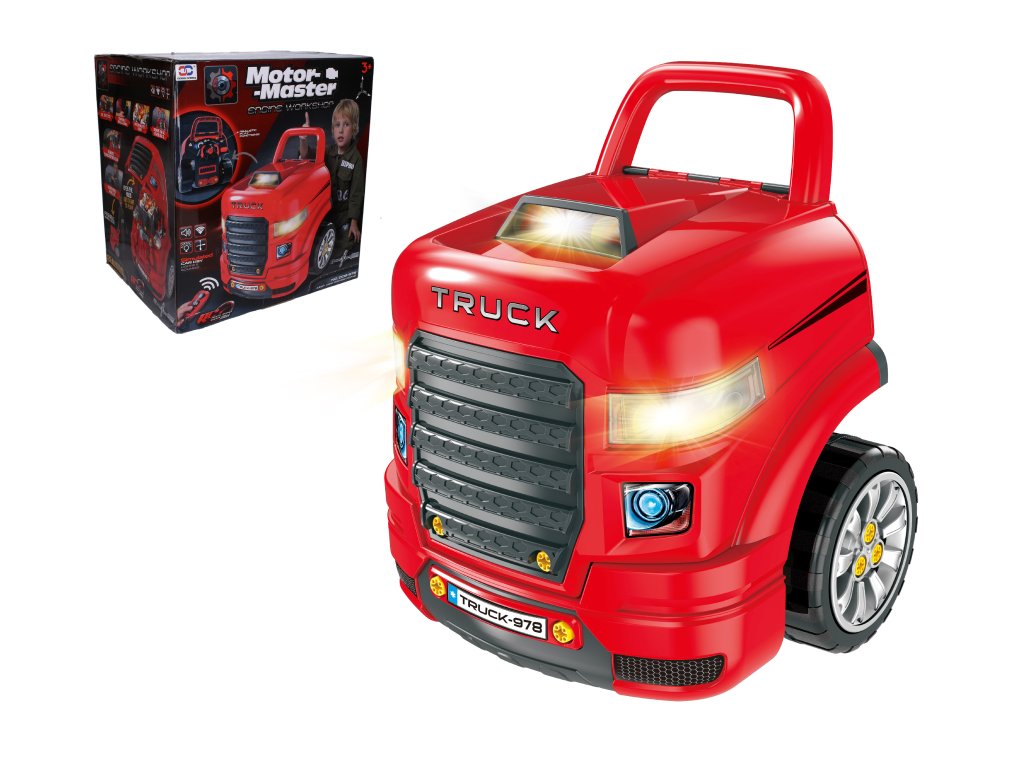 Motor šroubovací na dálkové ovládání - kamion. Rozměry 40x39x47 cm. Obsahuje 61 součástek. Klíče na dálkové ovládání (tlačítka pro odemčení, zamčení, klakson). Svítící přední světla, klakson, řadící páka, výstražné světlo, startovací tlačítko, odklápěcí kapota, osvětlení motoru, měření oleje. Světelné a zvukové efekty. 3xAA pro motor nejsou součástí, 1xCR2055 pro klíče součástí.