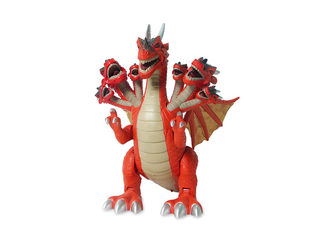 Sedmihlavý drak s efekty. Rozměry 31x18x28 cm. Světelné a zvukové efekty. 3xAA baterie nejsou součástí. Přepínač ON/OFF na spodní straně ocasu - chůze, efekty. Jen červená barva.