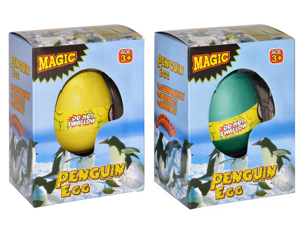 Vejce rostoucí tučňák. Velikost 6,5 cm. 12 ks display box. 4 varianty - modrá, zlatá, zelená, fialová.