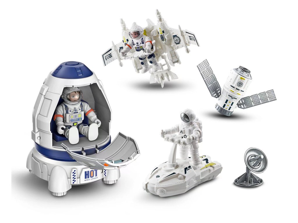 Vesmírný set s 2 figurkami. Velikost figurky 8 cm. Obsah - 2 figurky kosmonauta, raketa, družice, létající zařízení, 2 vznášedla, satelit, družice.
