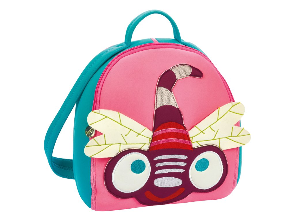 Menší, barevný batoh z polyesteru, motiv vážka, s rukojetí a nastavitelnými ramenními popruhy, velikost cca 10x19x24 cm. Pro děti starší 18 měsíců. Pozor: Délka popruhu by měla být nastavena dospělými.