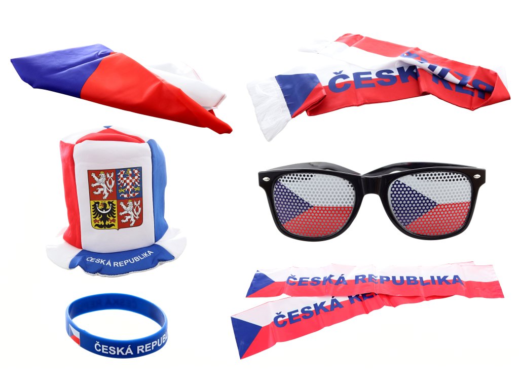 Fandící sada Česká republika pro opravdového fanouška. Sada obsahuje klasický klobouk, náramek, vlajku o velikosti 90x150cm, brýle, pár nafukovacích tyčí a šálu o velikosti 15*135cm.