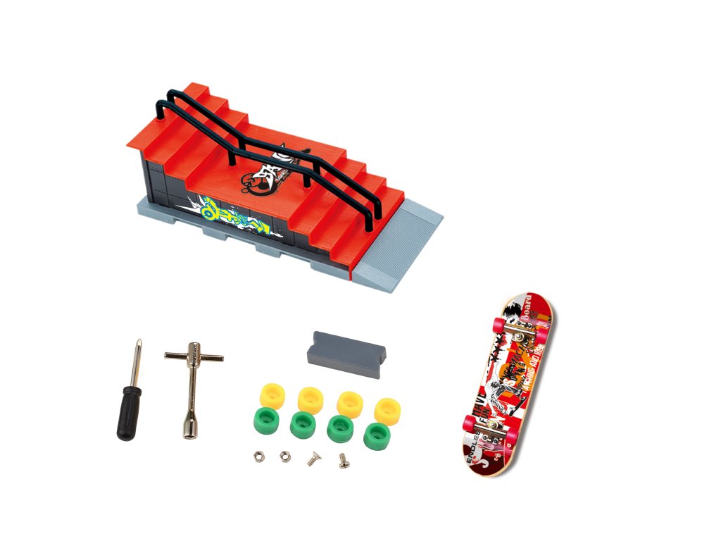 Fingerboard sada se schody. Rozměry schodů 23,5x10x9,5 cm, velikost fingerboardu 9,5 cm. Obsahuje: schodiště se zábradlím, 1x kompletní fingerboard, 4 náhradních koleček, 2 náhradní šroubky, 2 náhradní matice, šroubovák, klíč.