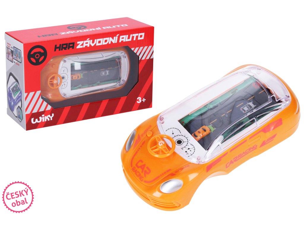 Hra závodní auto oranžová. Rozměry 17x8x5 cm. Světelné a zvukové efekty. 3xAAA baterie nejsou součástí. Ovládání volantem. Aktivace tlačítkem vlevo od volantu. Cílem hry je vyhýbat se autům na silnici.