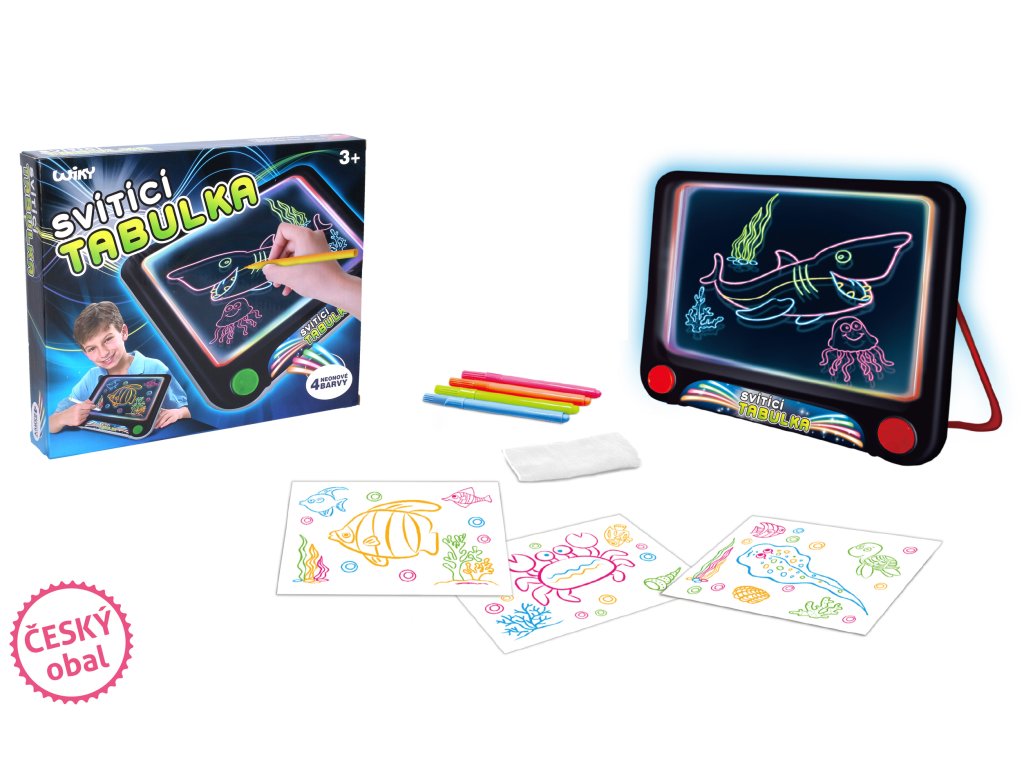 Kreslící tabulka svítící. 3xAAA baterie nejsou součástí. Velikost 25,5x23,5x3,5 cm. Návod na krabici. Obsahuje: mazací fixy, hadřík na mazání, šablony.