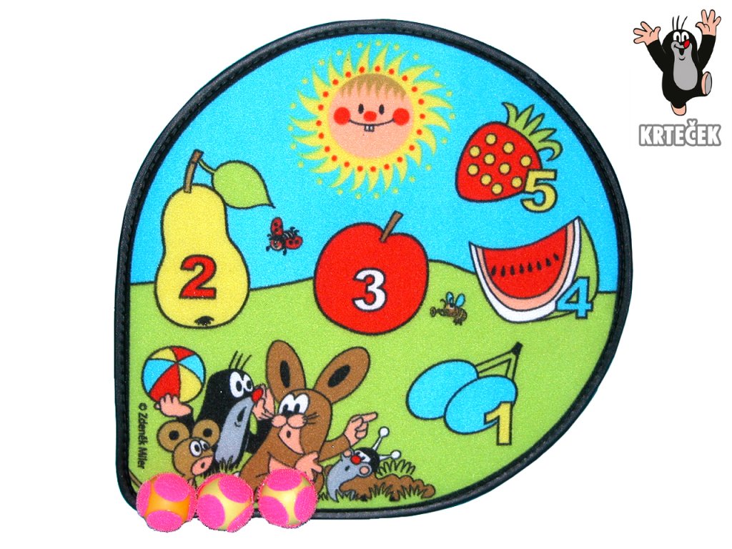 Terč s kuličkami na suchý zip. S motivem Krtečka - letní radovánky. Balení obsahuje terč a 3 míčky.