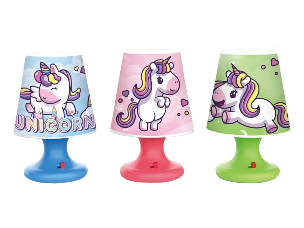 Lampička mini jednorožec. Rozměry 7,2x10,9 cm. 3xAG13 baterie součástí. 12 ks display box. 3 varianty - modrá, růžová, zelená.