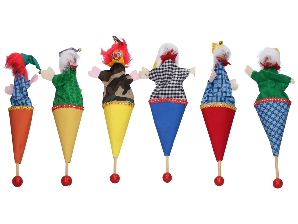 Loutka klaun. Velikost 27 cm. Dřevo a textil.