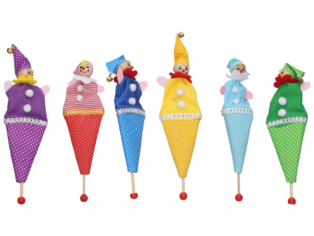Loutka klaun. Velikost 21,5 cm. Dřevo a textil.