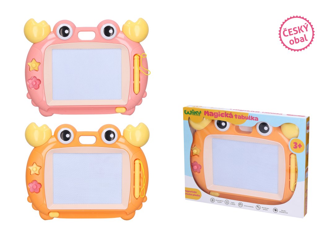 Magická kreslící tabulka. Velikost 33cm. 2 varianty- růžová, oranžová. Obsahuje tužku na kreslení na tabulku, magnetky na razítkování, posuvníkem se tabulka maže.