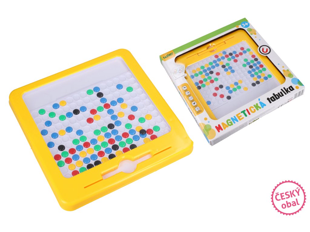 Magnetická tabulka. Velikost 25cm. Pomocí přiložené magnetické tužky se umísťují barevné magnetky na potřebná místa a tvoří se tak libovolný obrázek. Obsahuje předlohy s různými obrázky. Přitlačením magnetické tužky na tabulku se magnetka přichytí k tužce, dá se tak přemístit a oddálením tužky od tabulky magnetka spadne na příslušné místo.