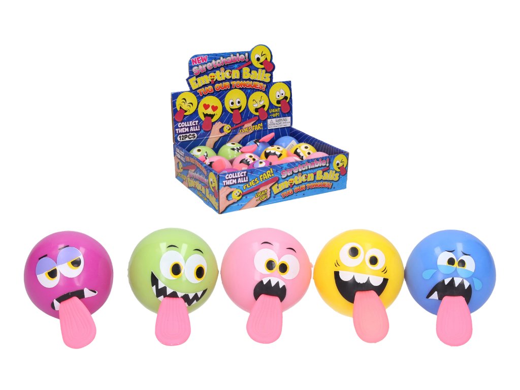 Míček úsměv s jazykem. Velikost 5,5 cm. Roztahovací jazyk. Světelné efekty, baterie nelze měnit. 12 ks display box. 5 variant - modrá, zelená, žlutá, růžová, fialová.