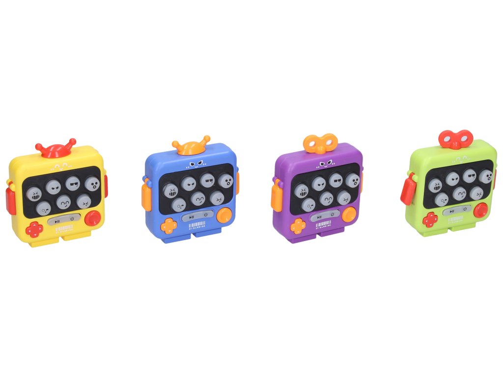 Plácni krtka hra 7cm. baterie 3xAG13 součástí, 24ks v display boxu. rozměry: 7.3x2.5x7.7cm. Tlačítko on/off, po zapnutí se začnou rozsvěcovat jednotlivá tlačítka s obličeji a hráč je musí rychle stihnout zmáčknout, než se rozsvítí další. 4 varianty - žlutá, modrá, fialová, zelená.