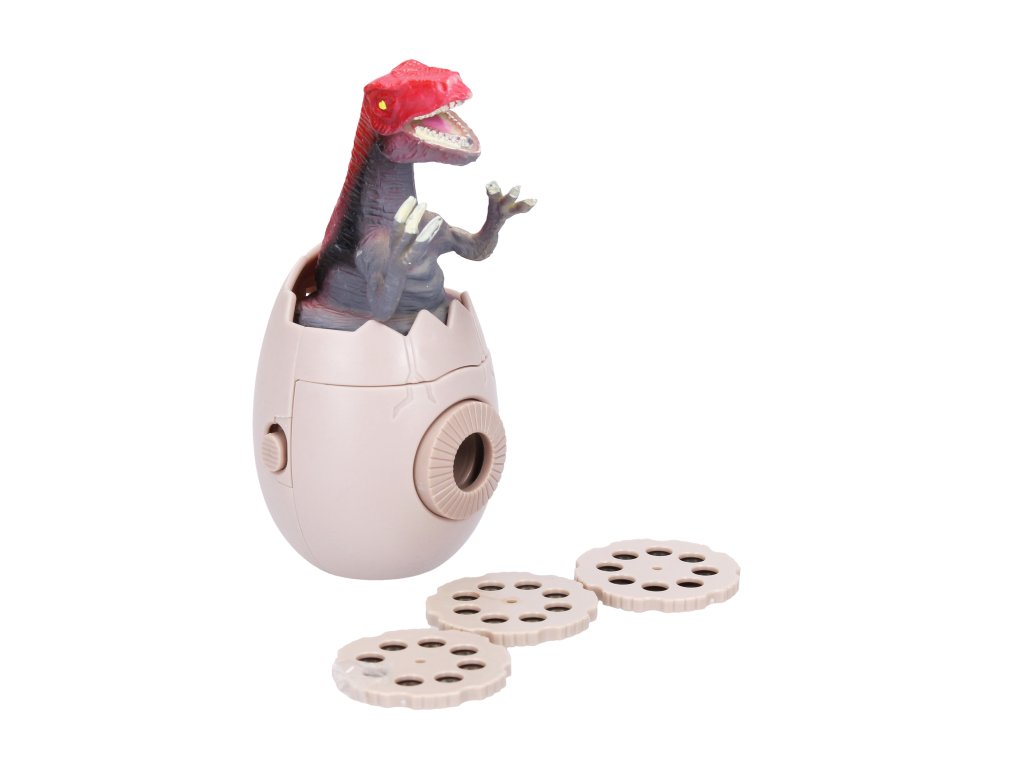 Projektor s dinosaurem. Rozměry 5x5x10 cm. Součástí projektor, 3 promítací kolečka. 3 varianty.