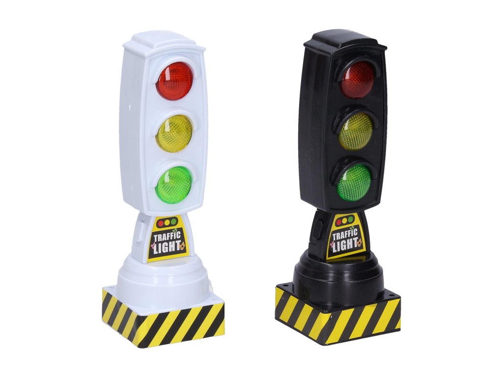 Semafor s efekty. Velikost 13,5 cm. Světelné a zvukové efekty. 3xAG13 baterie součástí. 12 ks display box. 2 varianty - černý, bílý.