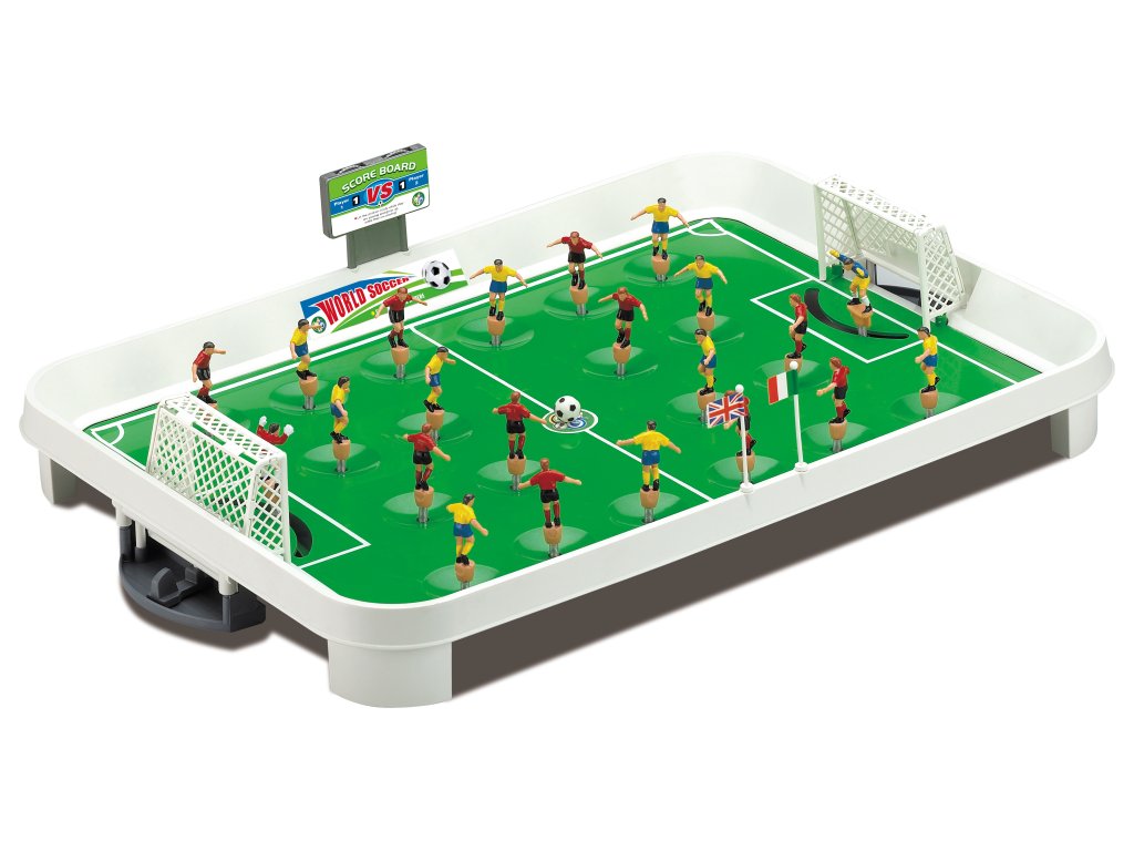 Stolní fotbal. Rozměry 53.5x37x6cm. Figurky fotbalistů na pružinkách. Pohyblivý brankář. Tabule na počítání skóre