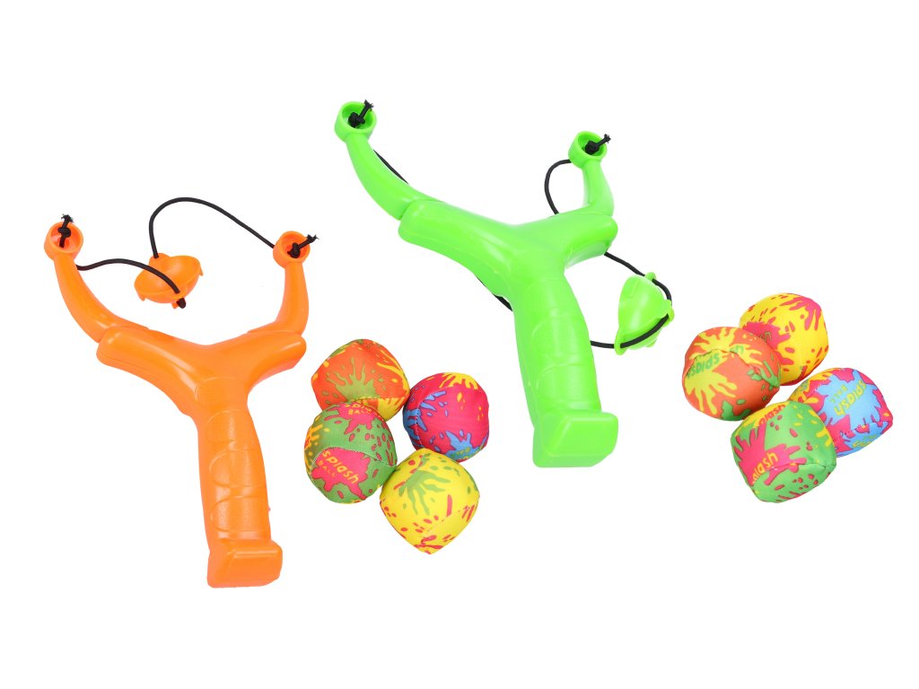 Prak s vodními bombami. Velikost praku 21 cm. Obsahuje prak, 4 vodní bomby.