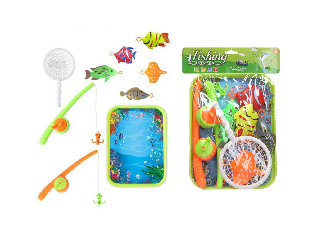 Chytání ryb. Rozměry vodní plochy 27x20x2 cm. Součástí 5 ryb, 2 udice, síto, vodní plocha.