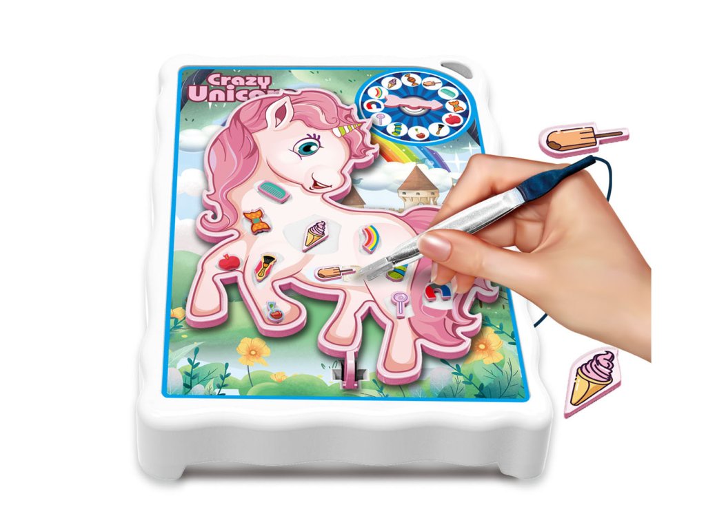 Jednorožec hra. Velikost hrací tabulky je 18x3,5x15 cm. Obsah balení: hrací deska s pinzetou. 12 předmětů. 12 samolepek - aplikujte na jednotlivé předměty. Roztoč ruletu a snaž se vyjmout předmět z těla jednorožce pomocí pinzety. Při kontaktu pinzety s povrchem hrací desky se jednorožec rozvibruje. 1 nebo 2 hráči. 3xAA nejsou součástí. Ve spodní části hrací plochy se nachází malá přihrádka pro uschování předmětů.