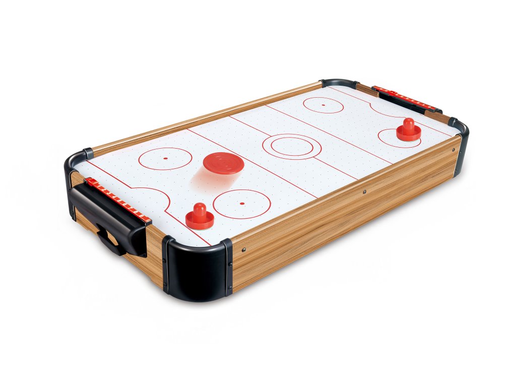 Vzdušný hokej air hockey stůl. Rozměry 76x38x9 cm. Baterie 6xAA, nejsou součástí. Pro 2 hráče.