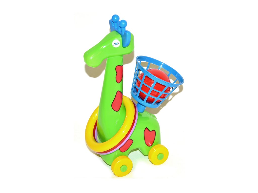 Žirafa házecí na kolečkách s kroužky a košíkem