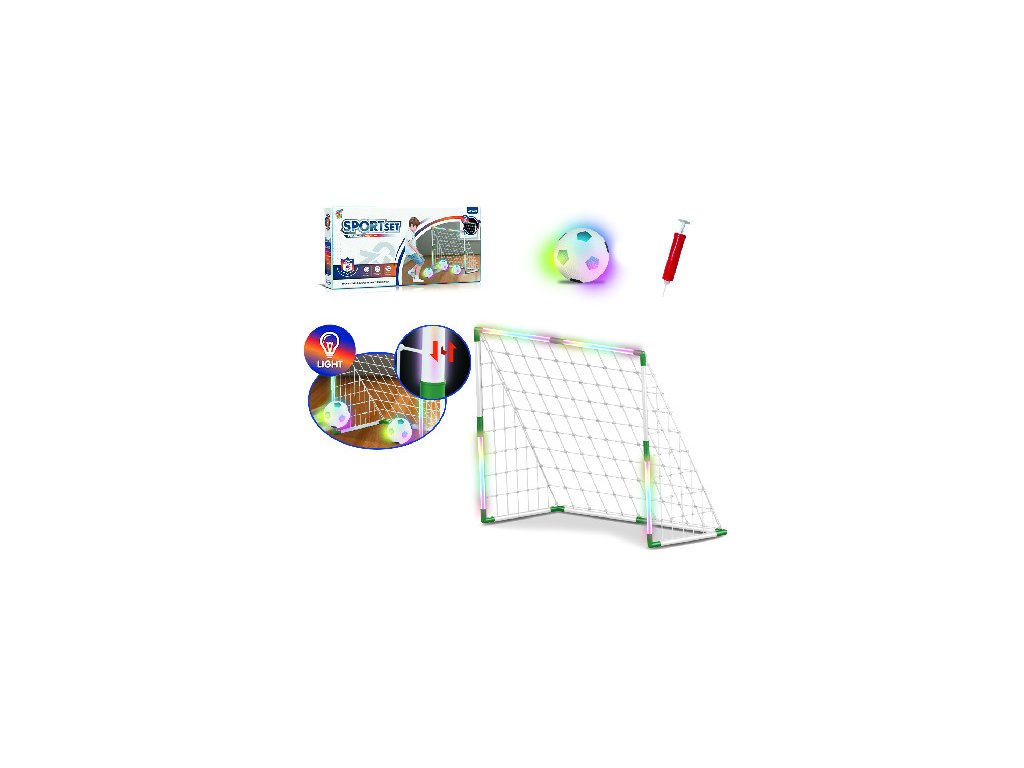 Fotbal set se světelnými efekty. Obsah balení - branka 88x36x68 cm, míč 14 cm, pumpička. Baterie míč - 3xAG13, branka 3xAG13, baterie součástí balení.