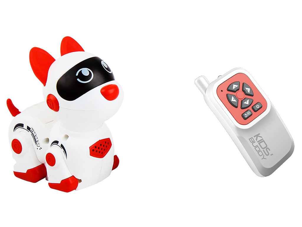 Mini pes RC na dálkové ovládání. Rozměry 5,5x9,5x10 cm. Infračervený port. Světelné a zvukové efekty. 4xAG13 baterie do psa součástí, 2xAAA do ovladače není součástí. Ovladač - ON/OFF tlačítko, programovací tlačítko, chůze všemi směry.