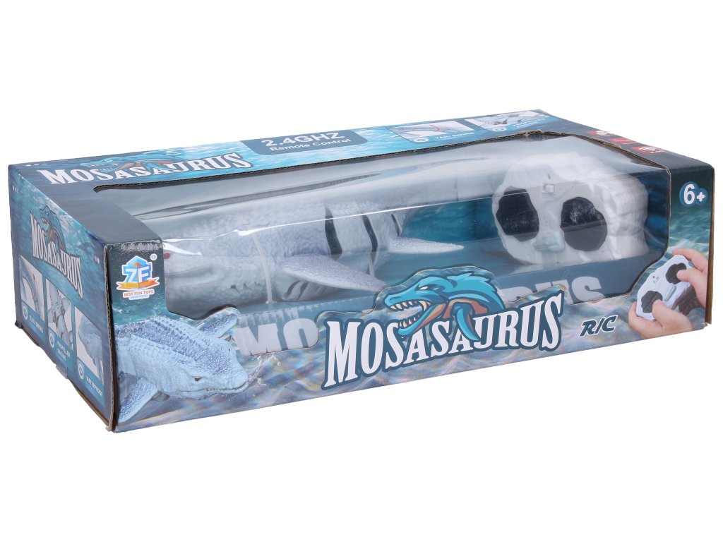 Mořský ještěr Mosasaurus RC na dálkové ovládání. Rozměry 36x16x6 cm. Frekvence 2.4GHZ. Plave ve vodě. Provozní doba 30 min, dosah 20 m. 3.7V 500mAh bateriový pack do ještěra, 3xAA do ovladače nejsou součástí. Ovladač - přepínač ON/OFF, tlačítko hlavy - demo režim, levá a pravá tlačítka pohyb dopředu a dozadu. USB adaptér místo kabelu součástí.
