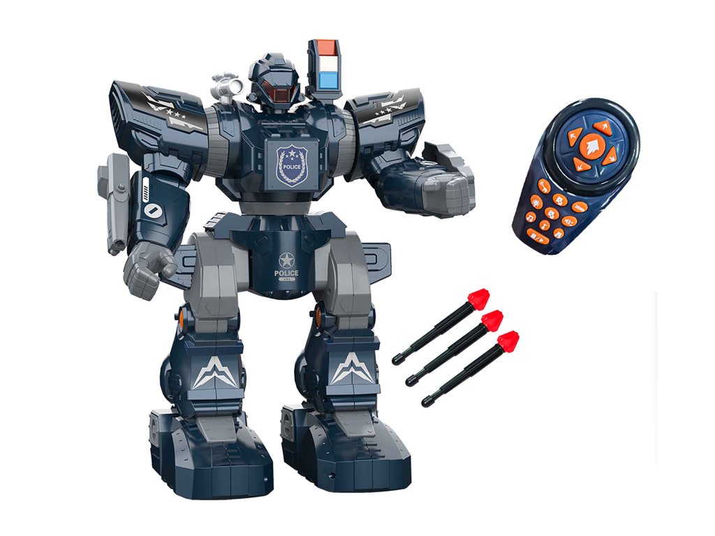 Robot Police střílející s efekty RC na dálkové ovládání 38 cm. Rozměry 31x17x38 cm. Infračervený port. Světelné a zvukové efekty. 4xAA baterie do robota, 2xAA do ovladače nejsou součástí. Součástí 3 šipky. Střelba manuálně tlačítkem na ruce. Ovladač - pohyb všemi směry, demo režim, efekt střelby, světelné efekty, programování, tanec, hudba, nastavení hlasitosti.