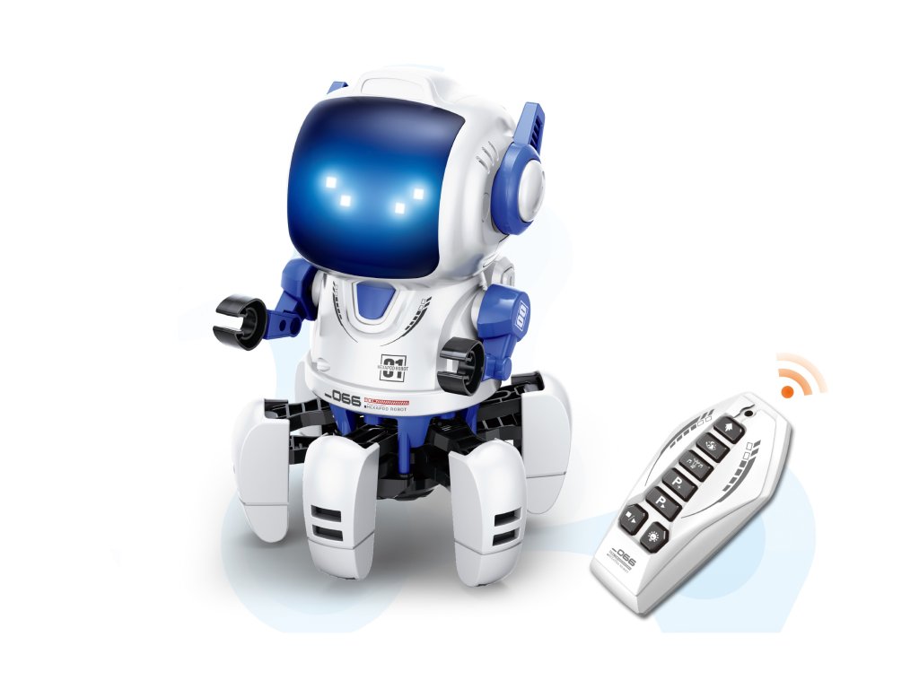 Robot se 6 nohama RC na dálkové ovládání. Rozměry 15x15x18 cm. Infračervený port. Světelné a zvukové efekty. Funkce - podsvětlený obličej (různé výrazy), programování, chůze, tanec, hudba. 3xAA baterie do robota, 2xAAA do ovladače nejsou součástí.