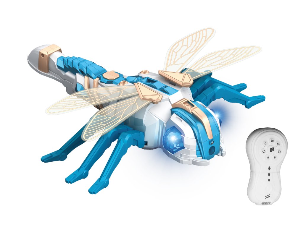 Vážka kouřící RC na dálkové ovládání. Rozměry 33x32x7,5 cm. Frekvence 2.4GHz. Světelné, zvukové a kouřové efekty. Tlačítka na ovladači - chůze dopředu, dozadu zatáčí, 3 módy kouřových efektů, 2 demo režimy, zvuk. 3.7V bateriový pack do vážky součástí, 2xAA do ovladače nejsou součástí. Přepínač ON/OFF na spodní straně vážky. Nádržka na vodu na spodní straně hlavy. USB kabel, nádobka na vodu součástí.