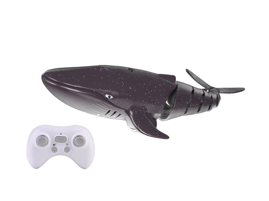 Velryba stříkající vodu RC na dálkové ovládání. Rozměry 35x12x8 cm. Frekvence 2.4GHz. Světelné efekty. 3.7V bateriový pack do velryby součástí, 2xAA do ovladače nejsou součástí. USB adaptér součástí. Ovladač - tlačítko ON/OFF, levé kulaté tlačítko - demo režim, pravé kulaté tlačítko - vodotrysk. Senzory na vodu na spodní straně velryby.