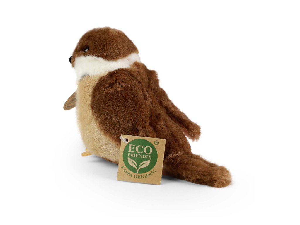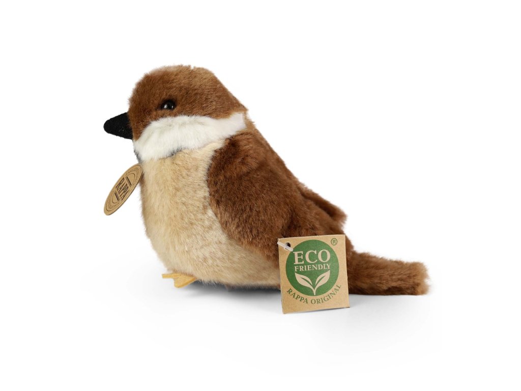 Plyšový pták vrabec měří 13 cm a díky těm nejkvalitnějším materiálům se řadí do Exkluzivní kolekce plyšových hraček značky Rappa. Díky ručnímu zpracování každého kusu navíc vypadá jako živý. Proč označení ECO-FRIENDLY? Rappa si je vědoma všech dopadů na životního prostředí, zaměřuje se na udržitelnost a omezení používání plastů na minimum. Proto je výplň hraček vyrobena z recyklovaných materiálů, zejména PET lahví. Ta je však zcela nezávadná a vhodná i pro děti od narození. FUN FACT: Věděli jste, že vrabci jsou velmi společenští ptáci a téměř nikdy nežijí sami?