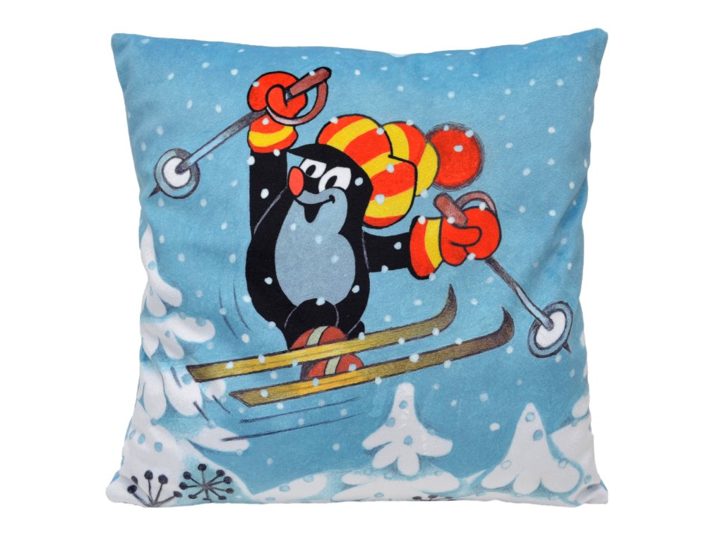 Měkoučký polštářek s motivem Krtečka na lyžích, vhodný do postýlky, na cesty i jako dekorace do pokojíčku. Materiál mikrovelur, obrázek tisk, náplň duté vlákno. Zadní strana sv. modrá.