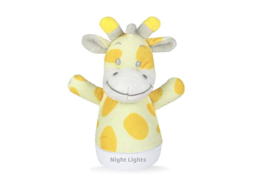 Lampička noční žirafa usínáček plyšový. Rozměry 11x8x15,5 cm. Aktivace přepínačem na spodní straně lampičky. Automaticky se měnící barevné světýlko (7 barev). 3xAAA baterie, nejsou součástí.