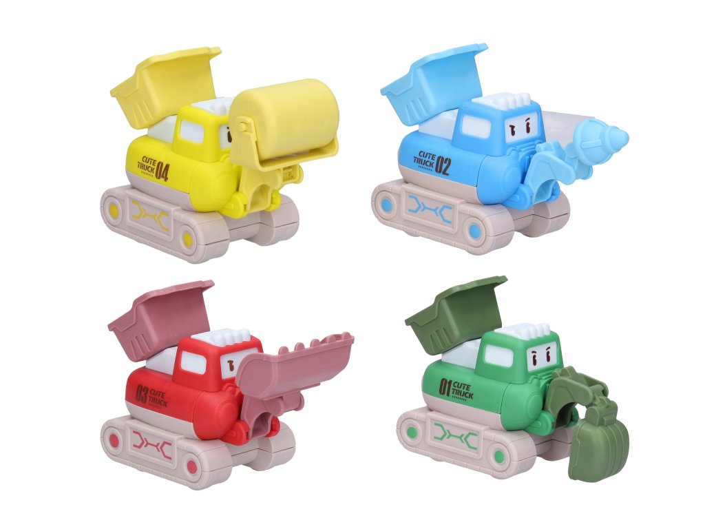 Stavební stroj. Velikost 13 cm. Natahovací, pohyb stlačením nakládací plochy. 12 ks display box. 4 varianty - modrý, zelený, žlutý, červený.