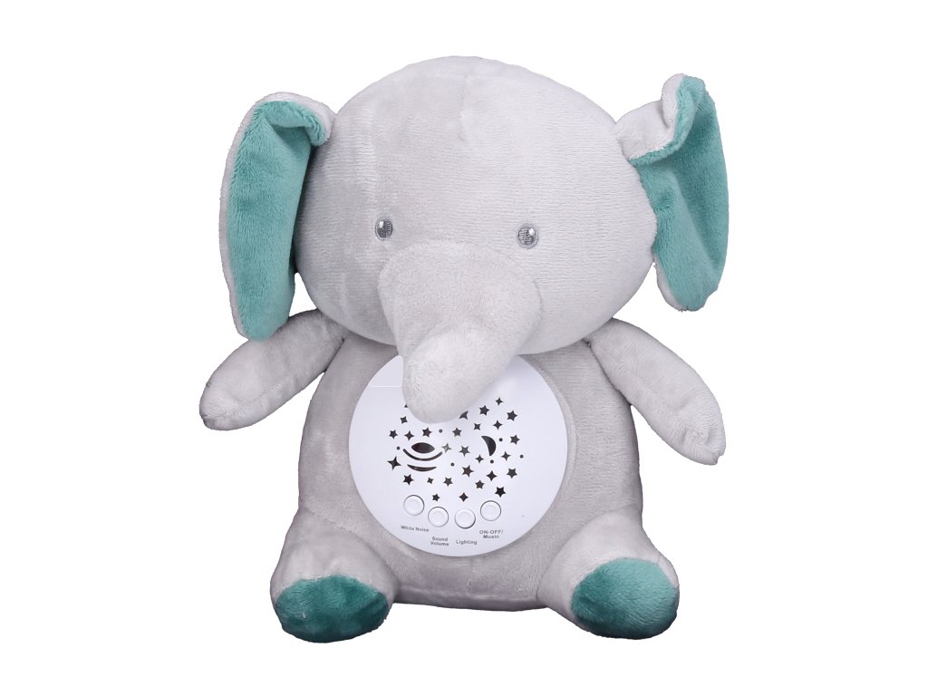 Usínací slon plyšový. Rozměry 26x12x25 cm. Funkce světla - 7 barev, mohou se automaticky měnit. 10 melodií, 4 bílý šum. Možnost nastavení hlasitosti. Automatické vypnutí po 30 minutách. 3xAAA baterie, nejsou součástí.