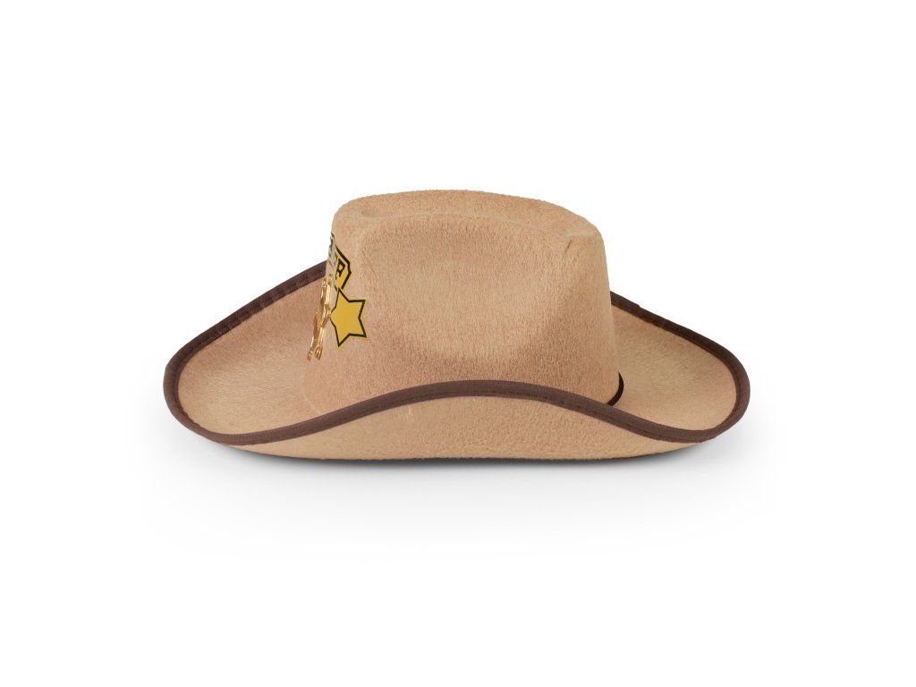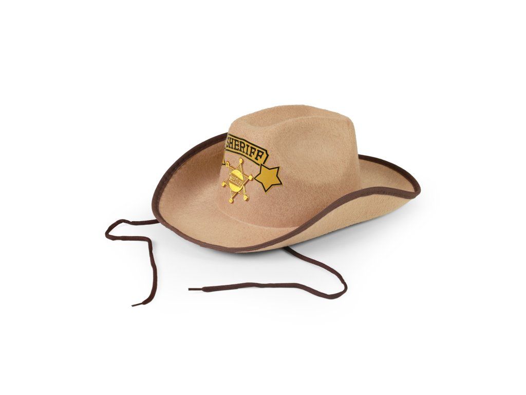Stylový klobouk pro všechny malé kovboje! Klobouk hnědé barvy je zdoben zlatou šerifskou hvězdou a doplněn nápisem SHERIFF. Součástí klobouku jsou také šňůrky.