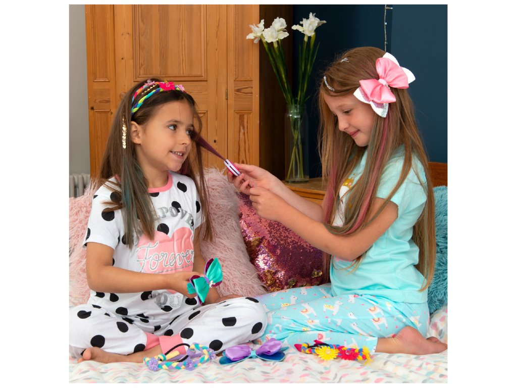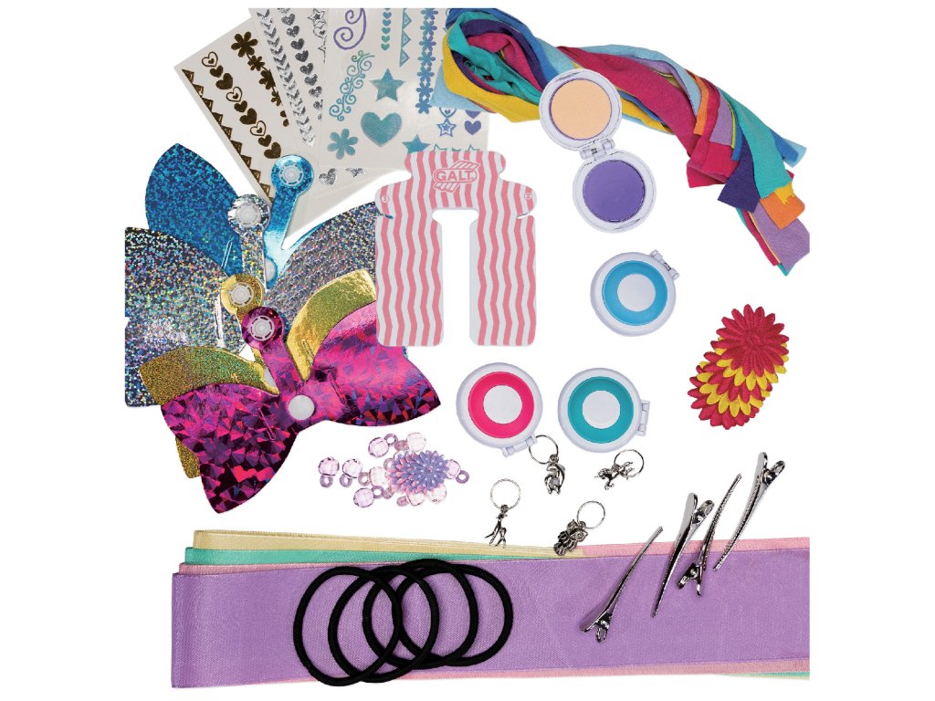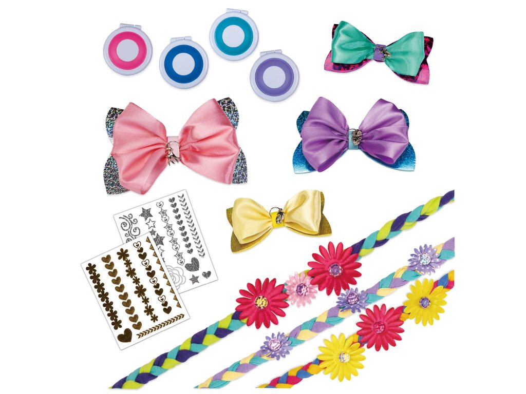 Obsah balení: 4 kompakty na vlasovou křídu, nástroj na výrobu pěnové mašle, holografické pěnové mašle, 4 stuhy, 12 různých látkových proužků, 12 látkových květin, 12 květinových korálků, 4 gumičky do vlasů, 3 plátky metalických tetování do vlasů, 4 přívěsky, 4 sponky do vlasů a anglický průvodce.