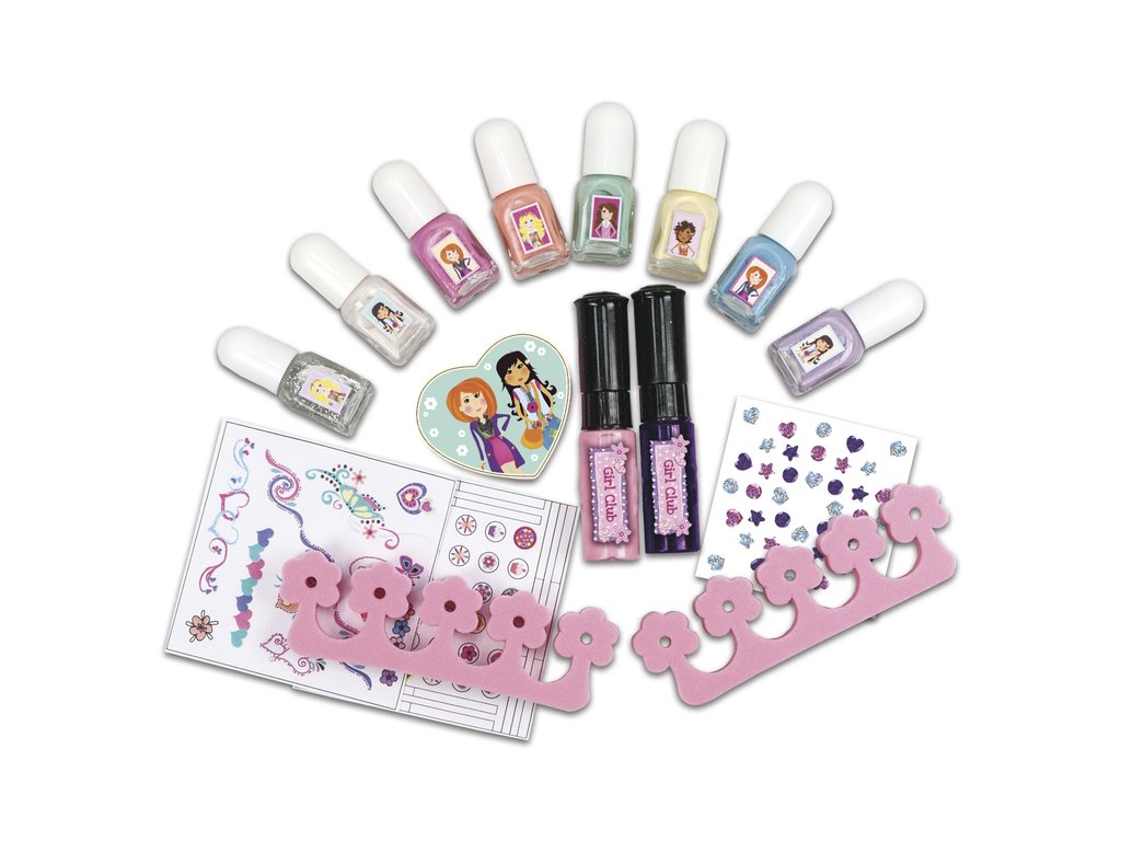 Obsah: 8 laků na nehty (7 barevných a 1 se třpytkami), 2 pera na nehty, samolepky na nehty, samolepící drahokamy, obtisky, 2 pěnové děliče mezi prsty, pilníček na nehty, průvodce.UPOZORNĚNÍ Nebezpečí udušení. Nevhodné pro děti mladší 36 měsíců. Obsahuje malé části, které by mohly být spolknuty nebo vdechnuty.