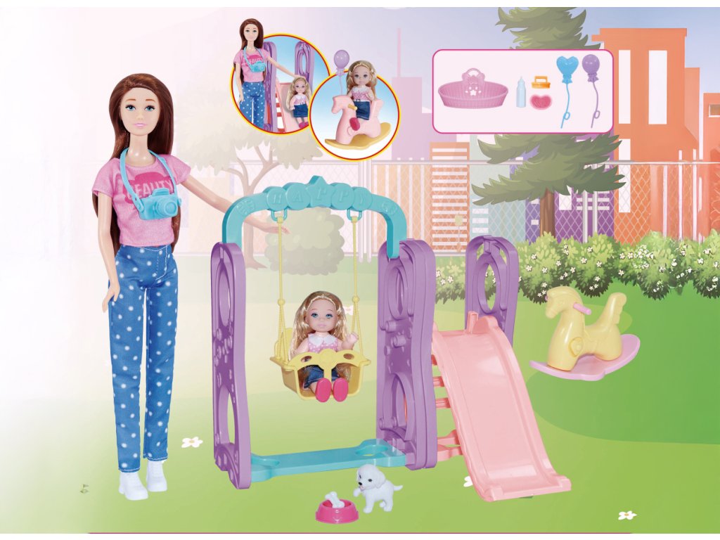 Panenka na hřišti. Velikost panenky 30cm, Obsahuje Panenku, holčičku, houpačku, skluzavku, houpacího koníka, štěňátko a doplňky.