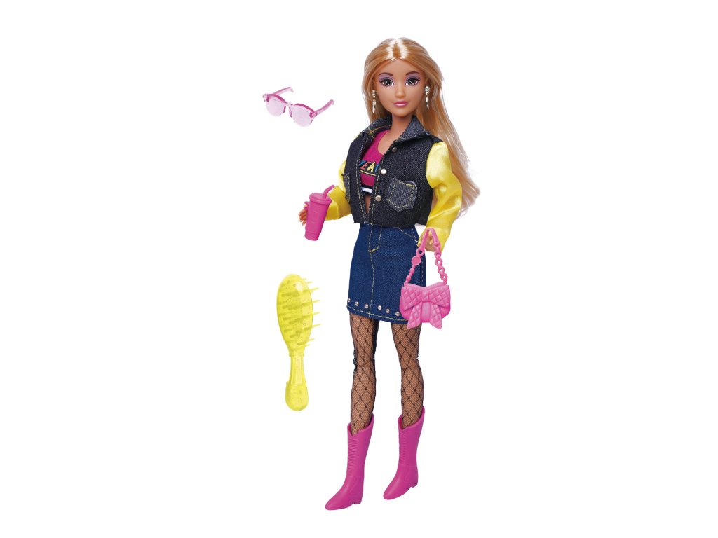 Panenka s doplňky. Velikost 30 cm. Doplňky - brýle, láhev, sluchátka, kabelka, hřeben.