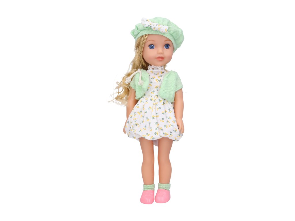 Panenka s kabelkou, čepicí a zvukovými efekty. Velikost 36 cm. Zvukové efekty stiskem bříška. 3xAG13 baterie součástí. Součástí hřeben a kabelka.
