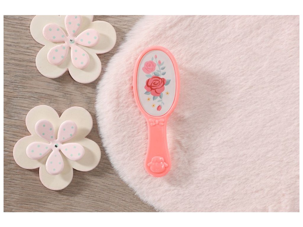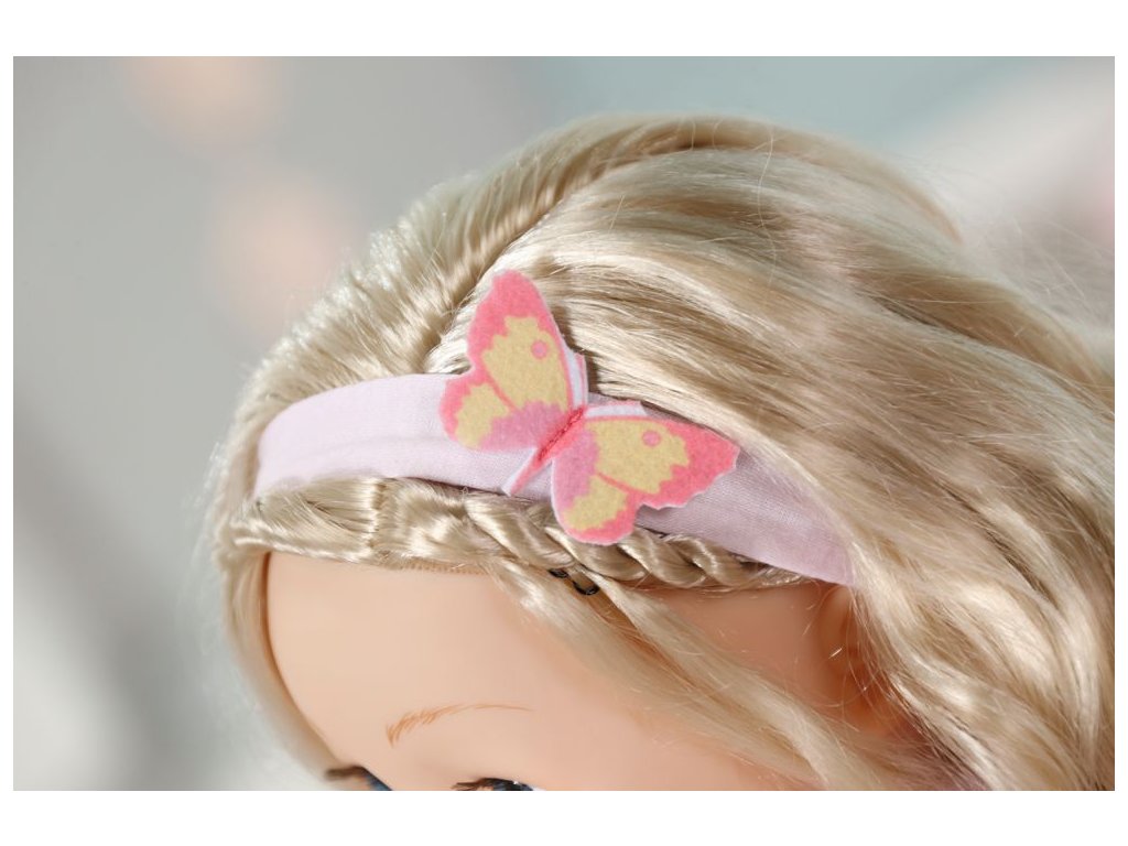 „Sophie, nehýbej se, máš ve vlasech motýla!“ Aha, to je jen motýl na čelence... Sophiiny kvalitní blonďaté vlásky lze upravovat do stále nových účesů a rozčesávat růžovým kartáčem. Malá milovnice růží má ale nejraději volně rozpuštěné vlasy a růžovou čelenku s motýlí ozdobou. Její oblíbené květiny má i na botičkách a šatičkách. Horní díl šatů má světle růžovou barvu a sukně je bílá. Legíny mají stejnou barvu jako dlouhé rukávy.