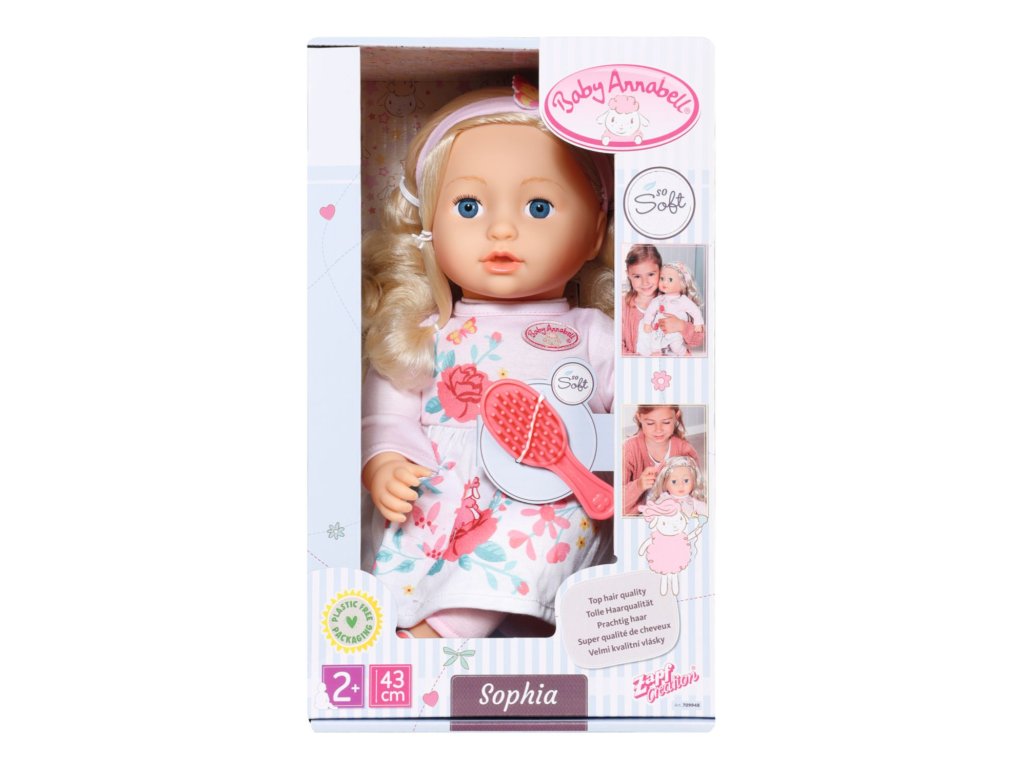 Baby Annabell Sophia je panenka velikosti 43 cm. Oblečena je do šatiček, legín a botiček. Součástí je čelenka a kartáč na vlasy.