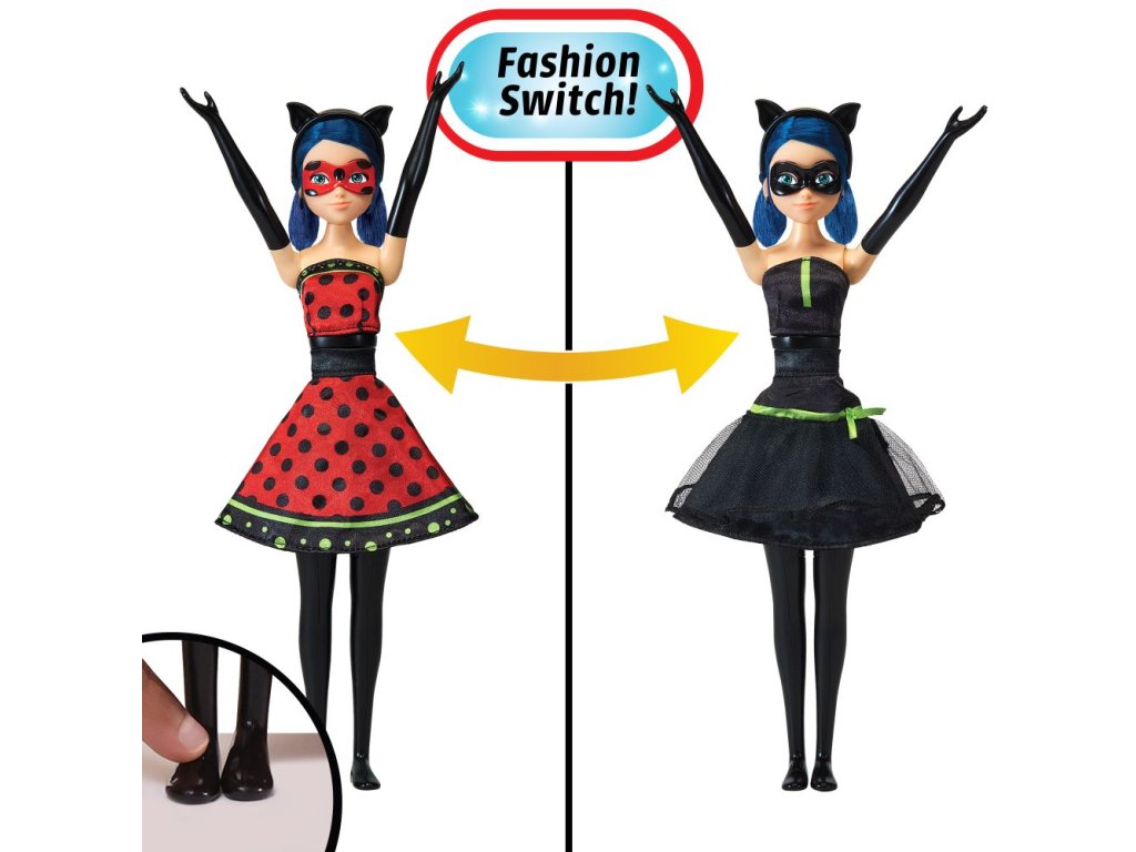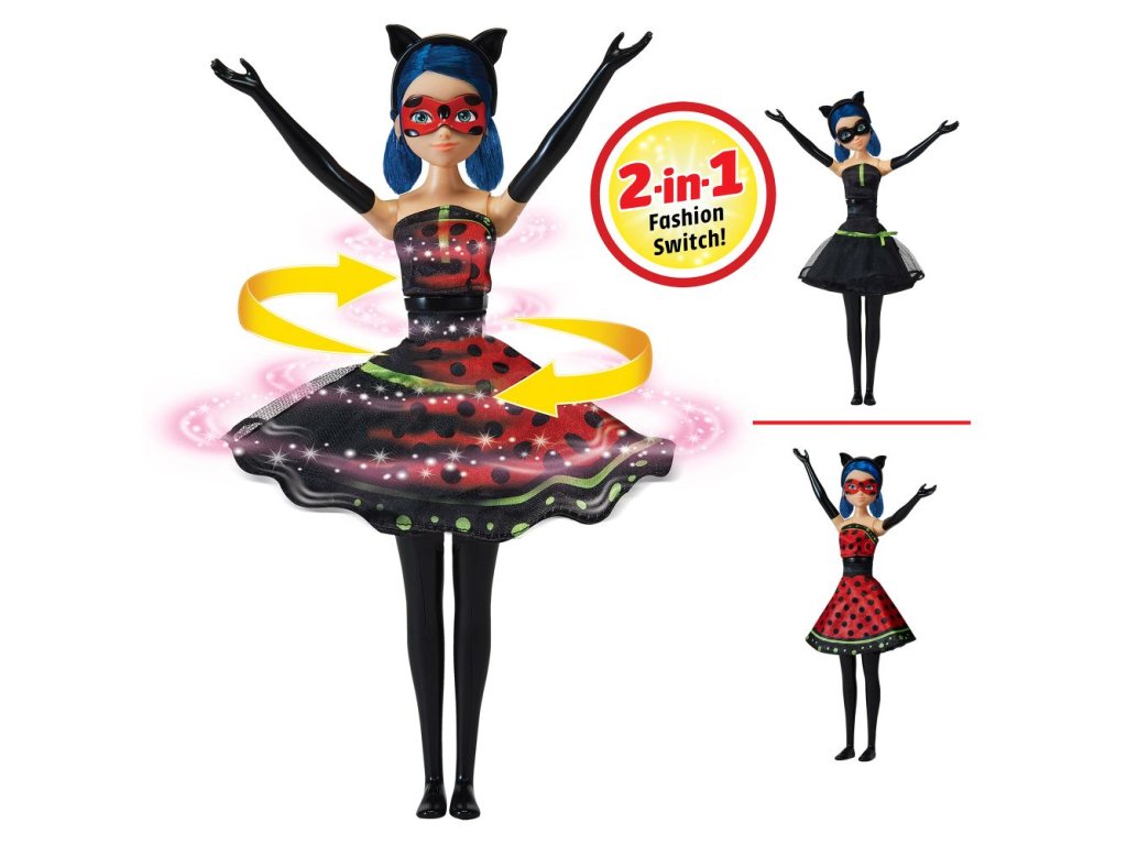 Marinette šaty se změní stisknutím tlačítka! Přepněte její kostými tlačítkem na noze panenky. Balení obsahuje také dopňky jako kočíčí uši a dvě masky.
