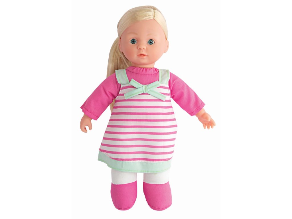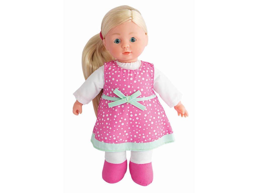 Panenka s měkkým tělíčkem a dlouhými vlásky v pěkných šatičkách. Výška panenky 30 cm. Náhrada za S 5010867.